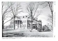 Other wealthy clients exported Seyfarth's talents when they built houses outside the Chicago area. Norman W. Harris (of Chicago's Harris Bank), whose intown residence was also in Winnetka, raised Arabian horses at Kemah Farm in Williams Bay, Wisconsin where his family lived in a "white cottage ..., one of the charming, low, rambling houses for which Robert Seyfarth, its architect, is famous.".[105] Another such client was Jessie Sykes Beardsley, who returned to her husband's farm in Freedom Township near Ravenna, Ohio in 1918 the year after his death and built a large house (locally known as the Manor House) which was designed by Seyfarth[106] that she had commissioned, presumably while she was still in Chicago. Here she operated the Beardsley Dairy for a number of years. Her husband Orasmus Drake Beardsley had been the secretary and treasurer of her father's Chicago-based company, The Sykes Steel Roofing Company, which made a variety of products including roofing materials and pool tables.[107] While there, according to the 1908 edition of The Chicago Blue Book of Selected Names, the Beardsleys lived at 4325 Grand Boulevard (now King Drive) on a street that today contains one of the most intact collections of residences built in the late 19th century for Chicago's elite. The same book also shows that Orasmus Beardsley was a member of various prestigious clubs, including The Chicago Athletic Association (where William Wrigley Jr. and L. Frank Baum were members) and the South Shore Country Club (now the South Shore Cultural Center), where he associated with the likes of Clarence Buckingham, John G. Shedd, John J. Glessner, Martin Ryerson, Clarence Darrow, Joy Morton and Willoughby Walling.[108] The Beardsley's Freedom Township house was later owned by Ohio State Senator James P. Jones. Another among Seyfarth's clients of this type was the mail-order innovator Aaron Montgomery Ward (1843–1913), who was briefly a neighbor after Seyfarth moved to Highland Park c. 1910. All of this notwithstanding, however, a careful analysis will show that Seyfarth served a broad-based clientele, and although he has a number of small houses to his credit the largest percentage of his work was done for what would be considered upper middle-class clients.