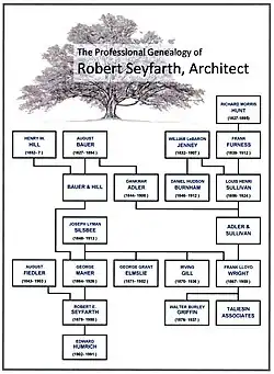 .[58] Seyfarth began his career as an architect at the age of 17 working for Fiedler during the time the latter was architect to the board of education, and records show his position at the time he was hired to be "messenger" (although, as noted above, his graduation notice suggested something more than that), for which he was compensated with a salary of $6.00 per week (about $168.07 in 2015).[59] Fiedler operated out of offices in Adler and Sullivan's Schiller (later Garrick Theater) Building[60] (1891, demolished 1961), and Seyfarth was almost certainly introduced to him through his uncle Henry Biroth, who was one of the earliest pharmacists in Chicago and served at various times as the secretary and president of the Illinois Pharmaceutical Association,[61] which occupied offices down the hall from Fiedler.[62] The Seyfarth family had been acquainted with Fiedler for several years before Seyfarth began to attend Chicago Manual Training School. Henry Biroth was an active member of Chicago's large ethnic German community, and in 1887, Fiedler (with his partner John Addison) had designed a house for him in Blue Island.[63] How long the young Seyfarth worked for Fiedler and the board of education is not known (Fiedler separated from the board of education late in 1896, and was replaced by Normand Patton[64]), but by 1900 he was working for George Washington Maher on the renovation of the interior of the Nickerson mansion for Lucius Fisher. Here, according to the Historic American Buildings Survey, he designed and carved the woodwork for the rare book room.[65]