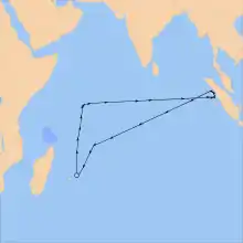 On 3 March 1789, he enlisted as a volunteer on the 700-ton Aurore,[6] a slave ship[3] bound for India under Captain Tardivet.[4] Aurore sailed to Pondicherry and ferried troops[8] bound for Isle de France.[6] On her next journey, seeking to purchase slaves on the Horn of Africa, Aurore was wrecked in the Mozambique Channel, drowning 400 enslaved Africans chained in the orlop.[8] Tardivet chartered the Portuguese San Antoine in October 1790 to return to Port-Louis, but had to divert to Sumatra because of the weather, and only returned to Port-Louis in late 1790, on a French ship via the French colony of Pondicherry.[8] Promoted to officer, Surcouf enlisted on the Courrier d'Afrique, another slave ship,[3] bound for Mozambique under Captain Garnier.[6] Captain Tardivet then brought him over as Lieutenant on his new ship, Revanche.[9] On Revanche, Surcouf made several expeditions off Madagascar.[6][9]