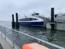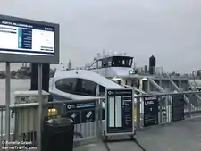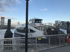 A fare for one trip was set at $2.75, the same as on other modes of transportation in New York City. Free transfers would be offered only to other NYC Ferry lines, meaning that riders would pay another fare if they transferred to one of the city's other mass-transit systems.[31] Transfers to other lines would be issued on request.[32] Prior to the implementation of NYC Ferry, other ferry lines in the city had weekday and weekend fares of $4 and $6, respectively.[33] The relatively low fare of NYC Ferry was made in contrast to some other major cities like San Francisco and Sydney, where ferry fares are higher than the fares of other modes of mass transit in these cities. The city said that the low ferry fares were intended to make the ferries affordable, while de Blasio stated that it is intended to promote "transit equity".[4] Assuming that the ferry system met the projection of 4.5 million annual riders, the city would pay a subsidy of $6.60 per rider, making the ferry the third-most subsidized form of transportation in the city, after the express bus service and the Long Island Rail Road.[34]