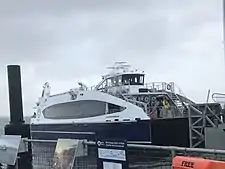 From January to June 2016, the city bought 4 boats for the proposed ferry service for a combined total of $6 million, with plans for a total of 30 boats over the coming years.[4] Hornblower Cruises requested 13 boats for the first routes, each costing $4 million.[4][43] The total combined cost of the boats is more than $70 million.[4][44] In addition, the city was building 13 ferry landings at a cost of $85 million, as well as a boat depot.[4] One of these docks, in Astoria, was built privately as part of the Astoria Cove development.[45] In September 2016, construction on 19 ferries began at two shipyards in Bayou La Batre, Alabama, and Jeanerette, Louisiana,[46][43] with 200 full-time employees working on the boats.[47][48] The contract with the two shipyards is unusual because shipbuilding contracts are usually with only one company. However, NYC Ferry executives had purposely chosen these two companies because of their expertise and because of the unlikeliness that both shipyards would be destroyed by hurricanes.[43]