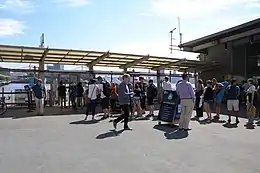 The first two routes were opened on May 1, 2017.[56][57] On its first day of service, NYC Ferry saw more than 6,400 riders; of these, 1,828 rode the Rockaway ferry while the rest rode the East River Ferry.[58] In its first week, the ferry transported 49,000 riders, of which 38,000 used the East River Ferry while the remaining 11,000 used the Rockaway route.[59] Although the service had a 95% on-time rate during the first week, NYC Ferry chartered a boat from NY Waterway due to delays on some routes.[50] NYC Ferry also continued to temporarily use some of the older East River Ferry boats on that route.[50] The ferry grew so popular that during the Memorial Day weekend in May 2017, the routes saw 26,000 passengers over two days, including 9,600 riders on the East River Ferry during each day.[60] Described by The New York Times as the service's "biggest test so far",[60] the 2017 Memorial Day weekend saw reports of hour-long waits for overcrowded ferries.[61]