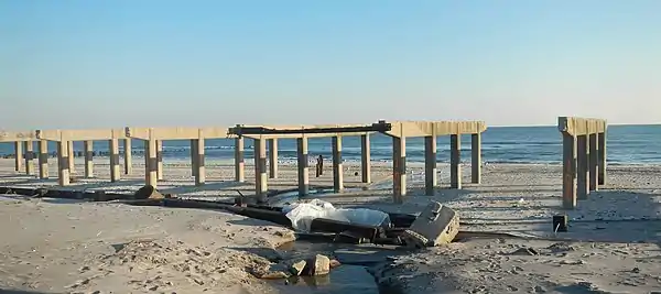 In 1878, the eastern community of Bayswater was laid out. One of Bayswater's early developers was William Trist Bailey, who had purchased the property.[17] In 1893, much of Hog Island, a small sandbar island off the coast of Far Rockaway washed away in a hurricane.[18] The remainder of the island eroded by 1902. Plates, along with older artifacts, still wash up along the shore of Rockaway Beach.[19][20]