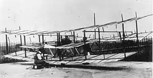 The Roe biplane was built in the coachhouse of Roe's brother in Putney and transported to Brooklands for testing in September 1907.[1] It was an unequal-span canard configuration two-bay biplane without any vertical stabilising surface or rudder and was originally powered by a 9 hp (7 kW) JAP engine mounted in front of the wing and driving a two-bladed aluminium pusher propeller mounted behind the wings. This proved insufficiently powerful to get the craft airborne. Roe continued work on his aircraft, borrowing a French Antoinette engine of 24 hp (18 kW) to use instead. In order to carry the additional weight of this engine, Roe fitted additional lifting surfaces at mid-gap in the inner bay of the wing structure. With this motor, Roe was able to make several short flights in the aircraft; the first on 8 June 1908.[2]