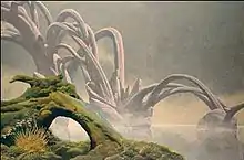 In the 1980s, Dean's output focused on other areas, including stage design, architecture, and video game art. In 1981, he collaborated with his brother Martyn on the Tectonic House, an environmentally-friendly and economic home built to last that was displayed at the annual International Ideal Home Exhibition in Birmingham. The idea spawned from two ideas: Dean's earlier designs for a bed and bedroom intended for the safety of children, and Martyn's "retreat pod" from 1970 that was featured in the Stanley Kubrick film A Clockwork Orange (1971).[11] The project has developed into its current name, Home for Life, and the non-working prototype contains no straight edges or right angles. In the early 2000s, the cost to produce one was estimated to be $75,000–$80,000. Although several local British governments have expressed interest in the project, none have come into fruition.[12][13][7] In 2003, a project involving the construction of 264 villas, chalets, and apartments designed by Dean on a 65-acre site near Stourport-on-Severn, Worcestershire had entered the planning stage.[12]