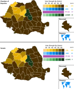 The Social Liberal Union (USL) obtained a huge majority in both the Chamber of Deputies and the Senate, with 60% and 59% respectively of the votes and in MP mandates, namely a record number of 395 seats. Far behind, the Right Romania Alliance (ARD) came in second place with only 17% of the vote and 80 seats, losing about half of what they won as the Democratic Liberal Party (PDL) in 2008.
