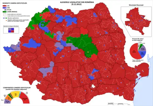 In May 2012, the new USL government passed an electoral law in parliament, which changed the election system to a single-round FPTP system without the 5% electoral threshold[3] with extra seats for minorities, both ethnic minorities and Romanian minorities. However, after PDL, fearing poor results in the elections ahead because of it, appealed the Constitutional Court of Romania who invalidated the law on 27 June 2012 and reinstated the old one.[4] A consequence of this is that after the 2012 parliamentary elections the size of the new Parliament grew to a record total number of 588, an added 117 seats than in the last parliament: 39 supplementary Senate seats, and 97 supplementary Chamber of Deputies seats, including the 18 seats for the ethnic minorities parties and organisations.