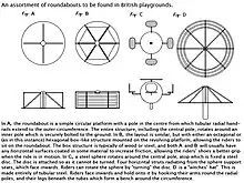A roundabout (British English), merry-go-round (American English), or carousel (Australian English), is piece of playground equipment, a flat disk, frequently about 2 to 3 metres (6 ft 7 in to 9 ft 10 in) in diameter, with bars on it that act as both hand-holds and something to lean against while riding. The disk can be made to spin by pushing or pulling on its handles, either by running around the outside, or by pulling and re-grabbing as it spins, from a stationary stance. If the disk is mounted at a tilt to the ground, after an initial push, the disk can be speeded up without further pushing or touching the ground. The trick is to have the rider(s) lean into the center of the disk while ascending and leaning out from the center when descending. It is the physics of angular momentum and also works for swings. Often found in school playgrounds and public parks, they offer riders (typically children) a dizzying ride when either others spin the wheel, or by spinning it themselves by running around it, and then jumping on. People may take turns between riding and spinning. One type of roundabout which differs significantly in terms of how the rotary motion is provided is a Swedish device called the HAGS Pedal Roundabout, which resembles four small exercise bikes attached to a tubular steel ring, which travel on a circular steel rail on the ground. The ring is attached to a vertical pole in the center by four spokes. There is a driving wheel hidden under the casing of each of the "exercise bikes" (the casings prevent toes being run over) and the roundabout is turned by the pedaling action of the riders.[1]