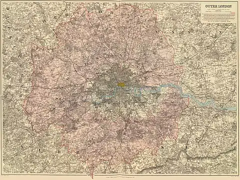 The area of the commission's scope covered the Metropolitan Police District,[lower-alpha 2] an area of 692.84 square miles (1,794.4 km2) and a population of more than 6.5 million in 1901.[3] In its report the commission described this as "Greater London" and the urban developed area at its centre as "the Metropolis". The area beyond the Metropolis was described as "Extra London".[4]
