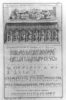 In spite of the high-flying and sometimes megalomaniac character of his plans, he managed to modernize his territories and his city, the prominence of which considerably increased. Rudolf died suddenly at Milan in 1365 aged 25.[1] His and his wife's mortal remains are buried at the Ducal Crypt underneath the Stephansdom in Vienna.[1]