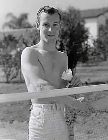 Early in his career, he was romantically linked with Mary Brian.[11] Gleason was married to Cynthia Hobart (later Cynthia Lindsay), who was a stunt woman and swimmer, and later wrote a biography of Boris Karloff. The entire Gleason family were close friends with Karloff, and the young couple became the godparents to Karloff's daughter, Sara Jane.[12][13] Hobart also co-wrote George Burns' autobiography with the actor.[14] The Gleasons had a son, Michael, on June 1, 1939. After Russell Gleason's death, Cynthia remarried, to Lou Lindsay, and Michael took his step-father's last name, and went on to become a television producer.[15]