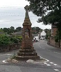 The parish's WWI war memorial is an 8 ft (2.4 m) carved cave within the sandstone cliff of the Brownhill. Located beside the road leading out of the village towards Baschurch, it is unique to Shropshire. It was conceived by the London architect Stanley Vaughan after a visit to Ruyton, and created by local father-and-son stonemasons Warwick and Len Edwards. The benches within the arch and the cross are all carved out of the rock. The memorial was unveiled in October 1920. The names of fallen from both the First and Second World Wars are listed on plaques within the archway. A third plaque, to an Alfred Rogers, was added in 2007 after he had been omitted from an earlier plaque.[16]