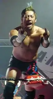 2001 was also the year when Saito finally broke out of his small role and achieved some championship success.[2] On August 14, he teamed with Magnum TOKYO and Dragon Kid to win the UWA World Trios Championship from CIMA, SUWA, and Big Fuji of Crazy MAX, and on September 30, he beat Susumu Mochizuki for the NWA World Welterweight Title.[4][5] His momentum came to a halt in late 2001 when the T2P class arrived in Japan, and he spent the next few months losing to Milano Collection A.T. and feuding with the newly-heel Genki Horiguchi.[2] It was during this time that he formed a close friendship with T2P student Anthony W. Mori.