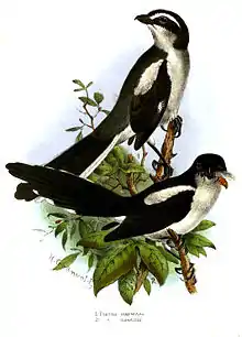 The São Tomé fiscal (Lanius newtoni), or Newton's fiscal, is a species of bird in the family Laniidae. It is endemic to São Tomé Island, São Tomé and Príncipe. It is 20 to 21 centimeters long. The bird is black above with a white shoulder-scapular bar.[2] The São Tomé fiscal has a pale yellow chin, breast, belly, flanks vent and under tail.[2] Its graduated tail has all black central tail feathers and an increasing amount of white on outer web from inner to outer tail feathers.[2] The Lanius newtoni has a clear voice with a whistle tiuh tiuh often repeated and metallic tsink tsink audible over a long distance.[2]