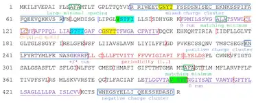 The protein sequence contains mixed, positive, and negative charge clusters, one of each, which are high in glutamine (Glu).[33] The clusters are located outside the transmembrane regions, and thus are solvent-exposed. Two 0 runs that run through several transmembrane domains in addition to a +/* run in between two transmembrane domains are also present. The protein contains a C-(X)2-C motif (CLLC), which is mostly present in metal-binding proteins and oxidoreductases.[36] A sorting-signal sequence motif, YXXphi, is also found at Tyr246 - Phe249 (YMLF) and Tyr446 - Leu449 (YELL).[37][38] This Y-based sorting signal directs the trafficking within the endosomal and the secretory pathways of integral membrane proteins by interacting with the mu subunits of the adaptor protein (AP) complex.[39] The signal-transducing adaptor protein 1 (STAP1) Src homology 2 (SH2) domain binding motif at Tyr446 - Ile450 (YELLI) is a phosphotyrosine (pTyr) pocket that serves as a docking site for the SH2 domain, which is central to tyrosine kinase signaling.[37][40] Multiple periodicities typical of an α-helix (periods of 3.6 residues in the hydrophobicity) encompass transmembrane domains.[41] 3 tandem repeats with core block lengths of 3 aa (GNYT, VSTF, STFI) are observed throughout the sequence.[33]