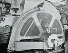 Electric power was provided by a steam plant of four Scotch boilers, each with three oil-fired furnaces, driving a General Electric eight-stage turbo-generator set which in turn provided power at 1,100 volts, 1,234 amperes rated at 2,350 kilowatts delivering 50-cycle alternating current to the General Electric synchronous-type electric motor with a rated 3,000 horsepower running at 1,150 volts and 1,180 amperes driving the shaft and 15-foot (4.6 m), four-bladed propeller with pitch of 8 feet 9 inches (2.7 m) of the built-up type with cast-iron hub and manganese bronze blades.[15] Motor control was by two levers, one for motor speed and another for forward or reverse.[15]
