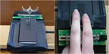 Using the device pictured on the right, Ziat et al. (2010) demonstrated a phenomenon akin to the saccadic suppression of image displacement (Bridgeman et al., 1975) in the tactile system. Under certain conditions participants failed to detect that dots had changed location as they moved their fingers over the tactile display.