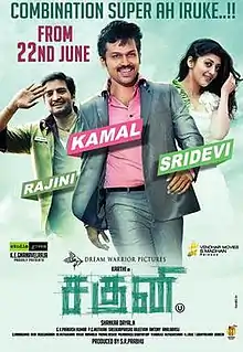 Saguni is a 2012 Indian Tamil-language political comedy film directed by Shankar Dayal and produced by S. R. Prabhu. The film stars Karthi and Pranitha, while Santhanam, Prakash Raj, Kiran Rathod, Kota Srinivasa Rao, Raadhika Sarathkumar and Nassar appear in supporting roles. Dubbed versions of the film were released in Telugu and Hindi as Shakuni (2012) and Rowdy Leader (2016) respectively. The film was declared an average hit.