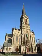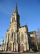 It is a Gothic Revival-style stone church in the form of a Latin cross, 177 feet (54 m) long and 92 feet (28 m) feet wide. It was designed by German-born architect, Adolphus Druiding.[2] Plans and designs for the church began in 1887, and in 1890 it was finished and dedicated. The Lockport sandstone and Medina brownstone were hauled by barge down the Erie Canal. The building was designed to seat 1,100 parishioners.[3] The organ was built by J. W. Steere & Son Organ Company of Springfield, Mass and has 2,169 pipes. The church bells were manufactured by the Meneely and Kimberly foundry, and by the McShane Bell Foundry.