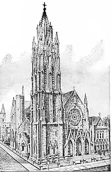 A third church was built from 1865 to 1870 at the corner of 53rd Street and Fifth Avenue based upon a design by Richard Upjohn and his son Richard Michell Upjohn.[10] The cornerstone for the new church was laid on October 14, 1868.[12][6][13] Two years later, on October 6, 1870, the congregation moved into its new home.[12][6] This structure, in a neighborhood at the time dominated by the mansions of Manhattan's upper class, featured a prominent 260-foot (79 m) high tower and a bas-relief reredos by Augustus Saint-Gaudens and murals by John LaFarge.[10][14] Though the new Saint Thomas's was a parish church, its location and design evoked that of a cathedral.[15]