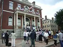 In 1628, Endecott ordered that the Great House be moved from Cape Ann, reassembling it on Washington Street north of Church Street.[16] Francis Higginson wrote that "we found a faire house newly built for the Governor" which was remarkable for being two stories high.[17] A year later, the Massachusetts Bay Charter was issued creating the Massachusetts Bay Colony with Matthew Craddock as its governor in London and Endecott as its governor in the colony.[18] John Winthrop was elected Governor in late 1629, and arrived with the Winthrop Fleet in 1630, one of the many events that began the Puritan Great Migration.[19]