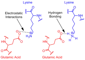 The salt bridge most often arises from the anionic carboxylate (RCOO) of either aspartic acid or glutamic acid and the cationic ammonium (RNH3+) from lysine or the guanidinium (RNHC(NH2)2+) of arginine (Figure 2).[1] Although these are the most common, other residues with ionizable side chains such as histidine, tyrosine, and serine can also participate, depending on outside factors perturbing their pKa's. The distance between the residues participating in the salt bridge is also cited as being important. The distance required is less than 4 Å (400 pm). Amino acids greater than this distance apart do not qualify as forming a salt bridge.[11] Due to the numerous ionizable side chains of amino acids found throughout a protein, the pH at which a protein is placed is crucial to its stability.