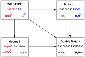 The contribution of a salt bridge to the overall stability to the folded state of a protein can be assessed through thermodynamic data gathered from mutagenesis studies and nuclear magnetic resonance techniques.[14] Using a mutated pseudo-wild-type protein specifically mutated to prevent precipitation at high pH, the salt bridge’s contribution to the overall free energy of the folded protein state can be determined by performing a point-mutation, altering and, consequently, breaking the salt bridge. For example, a salt bridge was identified to exist in the T4 lysozyme between aspartic acid (Asp) at residue 70 and a histidine (His) at residue 31 (Figure 3). Site-directed mutagenesis with asparagine (Asn) (Figure 4) was done obtaining three new mutants: Asp70Asn His31 (Mutant 1), Asp70 His31Asn (Mutant 2), and Asp70Asn His31Asn (Double Mutant).
