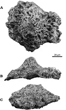 The osteoderms came in two types. There were larger oval plates with a length of up to twelve centimetres. These were keeled or spiked and perhaps were ordered in longitudinal rows along the back. The second type consists of small ossicles, rounded or pentagonal, about seven millimetres in diameter, that formed a continuous armour between the plates. A study in 2010 concluded that the larger plates had cancellous bone but that the ossicles had a denser bone tissue.[8]