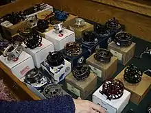 An American, Charles F. Orvis, designed and distributed a novel reel and fly design in 1874, described by reel historian Jim Brown as the "benchmark of American reel design", and the first fully modern fly reel.[23][24] The founding of The Orvis Company helped institutionalize fly fishing by supplying angling equipment via the circulation of his tackle catalogs, distributed to a small but devoted customer list.