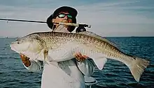 Saltwater fly fishing is typically done with heavier tackle than that which is used for freshwater trout fishing, both to handle the larger, more powerful fish, and to accommodate the casting of larger and heavier flies. Saltwater fly fishing typically employs the use of wet flies resembling baitfish, crabs, shrimp and other forage. However, saltwater fish can also be caught with poppers and other surface lure similar to those used for freshwater bass fishing, though much larger. Saltwater species sought and caught with fly tackle include: bonefish, redfish or red drum, permit, snook, spotted sea trout, tuna, dorado (mahi-mahi), sailfish, tarpon, striped bass, salmon, giant trevally and marlin. Offshore saltwater species are usually attracted to the fly by "chumming" with small baitfish, or "teasing" the fish to the boat by trolling a large hookless lure (Billfish are most often caught using this latter method).