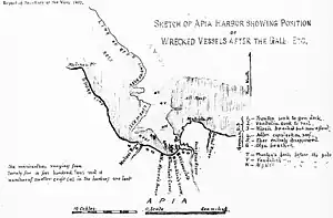 Apia and the beach covered in driftwood and debris from the wrecked warships.