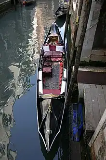 A sandolo is less ornate and of a simpler build than a gondola, but both have a pointed, decorated metal nose. It is also lighter and smaller than a gondola,[1] and can be recognized at a glance, as it always lacks the benches and high steel prow (called ferro) which is seen on a gondola.[2][3] The sandolo, like the larger craft, is rowed while standing up.[4] It can be fitted with a sail,[5] and also with an in-board or outboard motor.