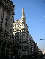 Santa Fe Avenue officially begins on the southern end of Plaza San Martín and the northern end of pedestrian Florida Street. The avenue affords a view of the Art Deco Kavanagh Building and Plaza Hotel (officially on Florida St.) and passes by the former Haedo and Paz palaces (today public buildings) before leaving the plaza's leafy surroundings. It continues westward along the Retiro area, passing by the Brunetta ("Olivetti") Building (built in 1964, one of the first in Buenos Aires designed in the International Style) and through the massive Avenida 9 de Julio, which was opened through the Retiro area in the early 1970s. The Greek Revivalist Argentine Scientific Society and the Art Deco Regina Theatre follow and, past Avenida Callao, Santa Fe Avenue enters its Recoleta stretch. This stretch of the upscale thoroughfare is considered one of the main shopping districts in the city.[2]