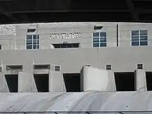 Santa Fe Dam is a flood-control dam on the San Gabriel River located in Irwindale in Los Angeles County, California, United States. For most of the year, the 92-foot (28 m)-high dam and its reservoir lie empty, but can hold more than 45,000 acre-feet (56,000,000 m3) of water during major storms. During the dry season, the basin behind the dam is used for groundwater recharge, as well as various recreational activities.