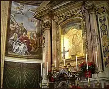 The apse was decorated by Giacinto Gimignani and Cristoforo Casolani. The latter also produced the frescoes of the four Evangelists in the dome and the ceiling fresco in the nave depicting The Ascension, Angels and Doctors of the Church (1624). In each of the eight sections of the dome are scenes from the life of the Blessed Virgin by several artists, while in the vault and the arches of the chapels are stucco angels by Ambrogio Buonvicino. In the first chapel to the right are frescoes of the story of San Carlo Borromeo and a Madonna and child with the saint (1624) by Giovanni da San Giovanni. The third chapel has a Walk to Calvary by Paris Nogari. The main altar has a Madonna with child with saints Stephen & Lorenzo from the early 15th century. In the third chapel on the left, is a Nativity by Girolamo Muziano, flanked by an Adoration of the Magi and Dream of St John both by Cesare Nebbia. In the first chapel to the left (north) is an Annunciation (1588) by Durante Alberti.