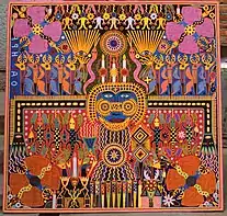Pensamiento y alma Huichol was created in 1997 Palais Royal-Musée du Louvre station as part of the RATP Group - Mexico City Metro alliance. This is his most renowned and talked about work, which represents Huichol deities, ancestors, myths, flora and fauna on a horizontal tripctic of the underground, the earth and the sky. The work is composed by 80 boards and elaborated with two million beads of 2 millimeters each one. It is located at the Palais-Royal Musée du Louvre towards the Carrousel du Louvre. On this work, researcher Miguel Gleason comments on his book México insólito en Europa: “Its perhaps the most impressive and detailed work in Europe, composed by more of 2 million beads that shows the cosmogony of that community (Huichol people)".[3]