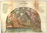 ![]() Top upper left: Pokrovskaya Church (Church of the Intercession of the Most Holy Theotokos) in Saratov, Top lower left: Saratov Administration Office, Top right: Saratov Conservatory, Middle left: Saratov Orthodox Theological Seminary, Middle right: Schmidt Mill, Bottom: A twilight view of Saratov Engels Bridge and Volga River | |