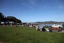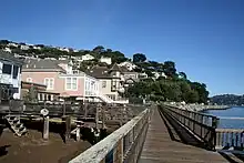 When Sausalito was formally platted, it was anticipated that future development might extend the shoreline with landfill, as had been the practice in neighboring San Francisco. As a result, entire streets, demarcated and given names like Pescadero, Eureka and Teutonia, remain beneath the surface of Richardson Bay.[11] The legal, if not actual, presence of these streets has proved a contentious factor in public policy, because some houseboats float directly above them. According to the San Francisco Chronicle, "State agencies say privately owned houseboats can't be located above the underwater streets because the streets are public trust lands intended for public benefit." The California State Lands Commission is reportedly pursuing a compromise which would move not the houseboats, but the theoretical streets instead.[12]