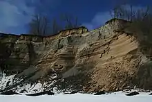 The Bluffs run 15 kilometres (9.3 mi) from the foot of Victoria Park Avenue in the west to the mouth of Highland Creek in the east, reaching as high as 90 metres (300 ft)— the equivalent of twenty-five storeys.[5] However, the escarpment continues westward inland, running between Kingston Road and Queen Street East, pausing over the Don Valley, and continuing on the north side of Davenport Road. The escarpment forms part of the old shoreline of Glacial Lake Iroquois, formed after the last ice age, which left valuable geological records as the part of the escarpment by the lake eroded. The eroded alluvial deposits from the Bluffs then settled westward to form the Toronto Islands.