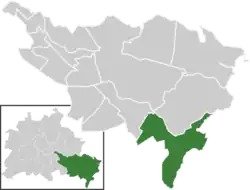 Located in south-eastern suburb of the city, Schmöckwitz represents the southernmost locality of Berlin, with its southernmost point at Rauchfangswerder, a little peninsula between the lakes of Zeuthener See (on Dahme river) and Großer Zug which represents, also with the lakes Krossinsee and Lake Wernsdorf, the borders of Schmöckwitz with Brandenburg. The bordering municipalities are Gosen-Neu Zittau (in Oder-Spree district), Königs Wusterhausen (with the civil parishes of Wernsdorf and Ziegenhals), Eichwalde (also with Miersdorfer Werder) and Zeuthen; all of them in Dahme-Spreewald district. The bordering localities within Berlin are Müggelheim and Grünau. The first is separated by the lakes Seddinsee and Langer See (Lake Langer), the second by a portion of the Berliner Stadtforst.[3]