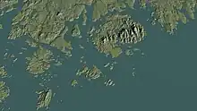 That same day we also passed near an island about four or five leagues [12–15 mi; 19–24 km] in length, off which we were almost lost on a little rock, level with the surface of the water, which made a hole in our pinnace close to the keel. The distance from this island to the mainland on the north is not a hundred paces. It is very high and cleft in places, giving it the appearance from the sea of seven or eight mountains one alongside the other. The tops of them are bare of trees, because there is nothing there but rocks. The woods consist only of pines, firs, and birches.[26]
