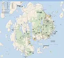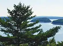 Acadia National Park encompasses a total of 49,075 acres (19,860 ha; 76.680 sq mi; 198.60 km2) as of December 31, 2017.[1] At least 30,200 acres (12,200 ha; 47.2 sq mi; 122 km2) on Mount Desert Island are included in the park, along with 2,900 acres (1,200 ha; 4.5 sq mi; 12 km2) on Isle au Haut, about 200 acres (81 ha; 0.31 sq mi; 0.81 km2) on smaller islands, and 2,366 acres (957 ha; 3.697 sq mi; 9.57 km2) on the Schoodic Peninsula.[note 1][10][11] As of 2015, the permanent park boundary, as established by act of Congress in 1986, included 12,416 acres (5,025 ha; 19.400 sq mi; 50.25 km2) of privately owned land under conservation easements managed by the National Park Service, which plans to acquire the land at some point.[2]