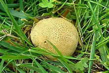 Like most members of Scleroderma, S. areolatum resembles but is only distantly related to the giant puffball. It can be distinguished from the giant puffball by cutting it in half; the puffball will have a solid, denser middle, with no signs of a developing cap mushroom. They are usually 1–5 cm in diameter, and grow individually or in small groups.[1] They are commonly found in deciduous forests, in neutral soil. They are poisonous,[2] and ingestion can lead to vomiting, diarrhea, and in larger quantities, fainting.