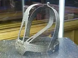 A scold's bridle, sometimes called a witch's bridle, a gossip's bridle, a brank's bridle, or simply branks,[1] was an instrument of punishment, as a form of public humiliation.[2] It was an iron muzzle in an iron framework that enclosed the head (although some bridles were masks that depicted suffering). A bridle-bit (or curb-plate), about 5 cm × 2.5 cm (2 in × 1 in) in size, was slid into the mouth and pressed down on top of the tongue, often with a spike on the tongue, as a compress. It functioned to silence the wearer from speaking entirely, and caused extreme pain and physiological trauma to scare and intimidate the wearer into submission. The scold's bridle was used primarily on women.[3] This prevented speaking and resulted in many unpleasant side effects for the wearer, including excessive salivation and fatigue in the mouth. For extra humiliation, a bell could also be attached to draw in crowds. The wearer was then led around town by a leash.