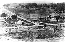 By 1854 the village comprised a post office, National School, Wesleyan Chapel, and an English Church.[12] Classified advertising from the time suggests the town was low-lying and scattered between the river and swampland.