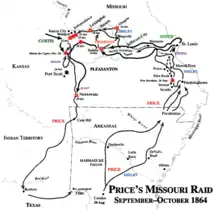 By the beginning of September 1864, the American Civil War had been continuing for several years, and events in the eastern United States, especially the Confederate defeat in the Atlanta campaign, gave President of the United States Abraham Lincoln, who supported continuing the war, an edge in the 1864 United States Presidential Election over George B. McClellan, who promoted ending the war. At this point, the Confederacy had very little chance of winning the war.[1] As events east of the Mississippi River turned against the Confederates, General Edmund Kirby Smith, commander of the Trans-Mississippi Department, was ordered to transfer the infantry under his command to the fighting in the Eastern and Western Theaters. However, this proved to be impossible, as the Union Navy controlled the Mississippi River, preventing a large scale crossing. Despite having limited resources for an offensive, Smith decided that an attack designed to divert Union troops from the principal theaters of combat would have the same effect as the proposed transfer of troops. Major General Sterling Price and the Confederate Governor of Missouri Thomas Caute Reynolds suggested that an invasion into the state of Missouri would be an effective offensive; Smith approved the plan and appointed Price to command the offensive. Price expected that the offensive would create a popular uprising against Union control of Missouri, divert Union troops away from principal theaters of combat (many of the Union troops previously defending Missouri had been transferred out of the state, leaving the Missouri State Militia to be the state's primary defensive force), and aid McClellan's chance of defeating Lincoln;[2] on September 19, Price's column entered the state.[3]