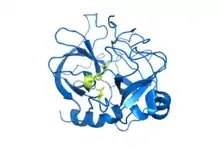 ![]() Crystal structure of bovine chymotrypsin. The catalytic residues are shown as yellow sticks. Rendered from PDB 1CBW. | |||||||||