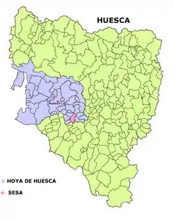 Sesa is a municipality located in the Hoya de Huesca comarca, province of Huesca, Aragon, Spain. According to the 2010 census the municipality has a population of 225 inhabitants.[2] Its postal code is 22110.