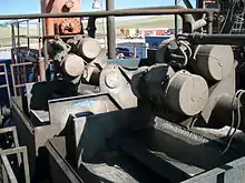 • Screen basket - Also known as the screen "bed" it is the most important part of the machine, it is responsible for transferring the shaking intensity of the machine, measured in "G's", while keeping the "shaking" motion even throughout the entire basket. It must do all that while holding the screens securely in place, eliminating drilled solids bypass to the hopper and allowing for easy operation and maintenance of the machine. Different brands of shakers have different methods of fulfilling these demands by using specialized screen tensioning apparatus, rubber seals around the screens, basket reinforcement to limit flex, rubber float mounts rather than springs, rubber deck seals and selective vibrator placement.