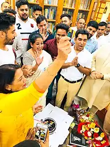 Sharmistha joined the INC in July 2014. Since then she has been actively participating in rallies organized by the party and working at the grass root level with the party workers in her area.[4] She contested the Delhi Assembly election in February 2015 from the Greater Kailash constituency[5] but lost, coming third with 6,102 votes after Saurabh Bharadwaj (AAP, 57,589 votes) and Rakesh Gullaiya (BJP, 43,006 votes).[6]